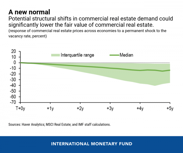 Sarà questo a fare la differenza. “Un aumento permanente dei tassi di sfitto di immobili commerciali di 5 punti percentuali (a causa di un cambiamento nelle preferenze dei consumatori e delle aziende) potrebbe portare a un calo dei valori del 15% dopo cinque anni”, spiega il Fondo. E in questo caso il new normal potrebbe risultare insostenibile per un settore così strategico per l’economia internazionale.