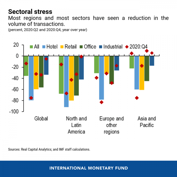 Il grafico sopra fotografa l’andamento delle transazioni in diverse regioni nei vari settori, con quello turistico a soffrire più di tutti, seguito però a ruota dal settore uffici. Notate che fra il secondo trimestre del 2020 e il quarto c’è stato un certo miglioramento, ma solo per alcuni settori e in alcune regioni. Gli hotel continuano a soffrire e il settore uffici in Europa, è pure peggiorato, al contrario di quanto si osserva in Asia e nel Pacifico e nelle Americhe.
