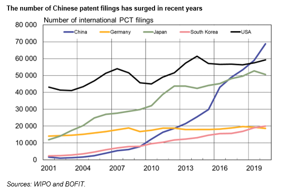 Veniamo alla cronaca. Gli ultimi dati della World International Property Organization (WIPO), ripresi da Bofit, confermano l’ascesa del peso cinese nella registrazione internazionale di brevetti che, nel 2020 sono cresciuti del 4% rispetto al 2019 portandosi a quota 275.900. La Cina guida ancora la classifica, visto che le sue registrazioni pesano un quarto del totale, ossia il 25%, a fronte del 22% statunitense e del 18% giapponese. Seguono da lontano Corea del Sud e Germania con il 7%.