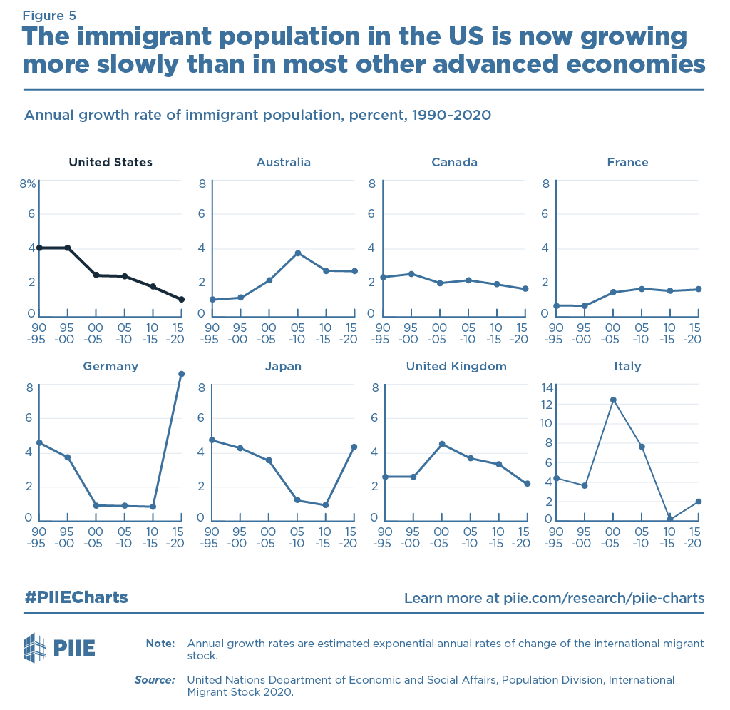 Un altro modo per valutare l’apertura di un’economia è osservare la crescita della popolazione immigrata, che negli Usa, come anche in altri paesi ad economia avanzata ha molto rallentato. E negli Usa persino più che altrove.