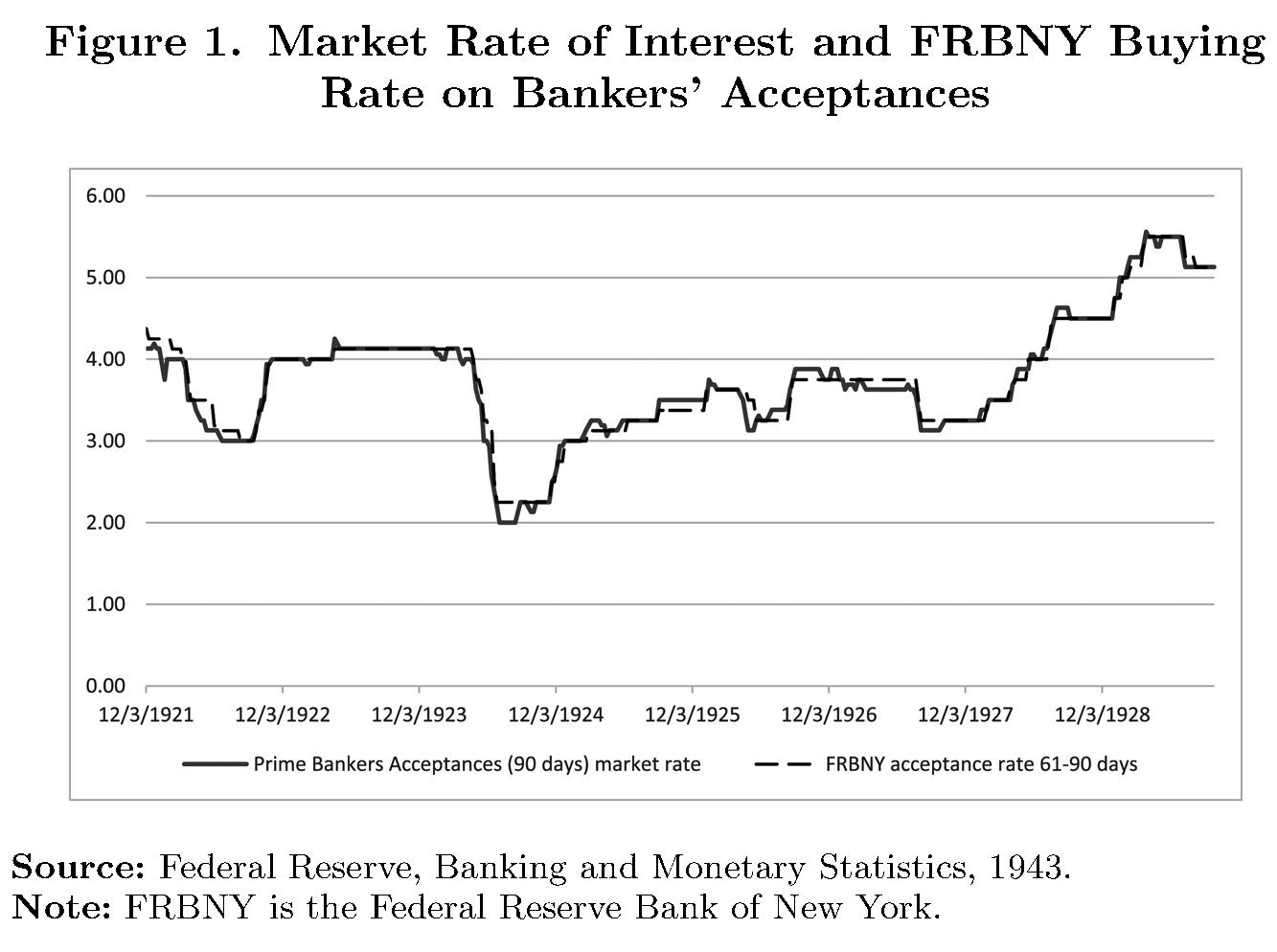 I tassi di questa “finestra” venivano gestiti dalle 12 banche di riserva federale e approvati dal board della Fed. L’analisi del nostro paper si concentra sulla Fed di New York. Il tasso fissato da questa banca influenzava notevolmente il mercato monetario. “I tassi massimi che le banche membri erano autorizzate a pagare sui depositi interbancari e sui certificati di deposito emessi alle banche nei primi anni ’20 erano entrambi inferiori e una funzione del tasso di sconto della Fed di New York”, spiega il paper. Diventa perciò interessante osservare l’andamento di questo tasso negli anni considerati.