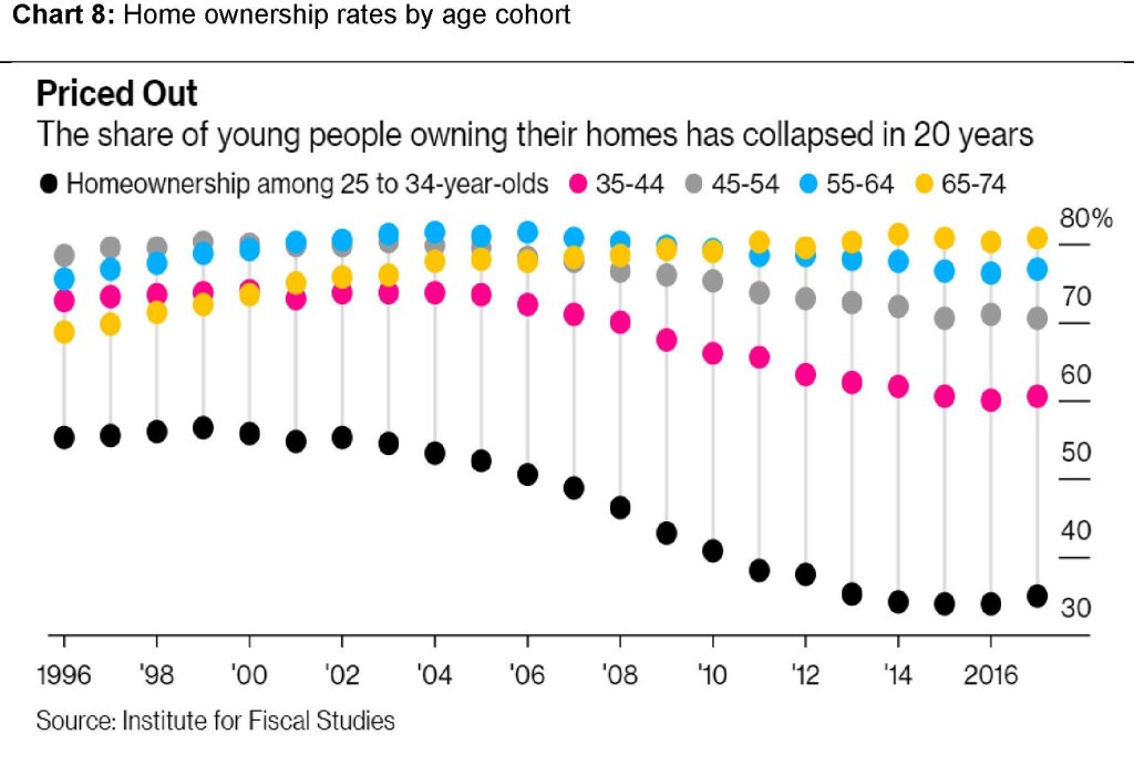 L’insieme di queste variabili compone l’immagine del settore, che ha visto crescere di ben 664 miliardi il debito per mutui delle famiglie nell’ultimo decennio, buona parte dei quali a carico di primi compratori. Il boom dei prezzi vissuto prima della crisi e la crescita successiva hanno sicuramente complicato la fisionomia del mercato, allargando anche le diseguaglianza. Per dirla con le parole di Cunliffe, “la banca di mamma e papà è stimata già essere il decimo prestatore più importante nell’UK”. Quindi fa molta differenza avere alle spalle una famiglia più o meno benestante, in un contesto di mercato che tira. E in effetti, come abbiamo visto dal grafico sopra, la quota dei giovani che compra casa è crollata nel tempo.