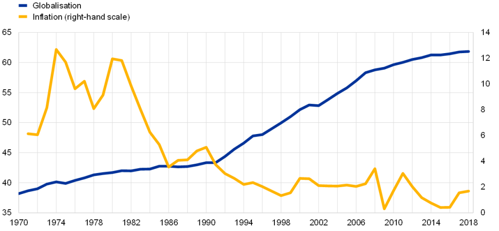 L’analisi della Bce, insomma, per quanto accurata, considera solo alcuni dei fattori che determinano una globalizzazione e focalizzandosi su quelli squisitamente economici rischia di peccare di aderenza alla realtà, che non è fatta solo di economia. E la Bce ne è perfettamente consapevole. ” I movimenti più bruschi dell’inflazione complessiva, verificatisi negli anni ’90 e poi di nuovo dopo il GFC, – scrive – sono probabilmente collegati ad altri fattori, come i cambiamenti nei regimi di politica monetaria, il calo delle aspettative di inflazione e la minore indicizzazione dei salari”.