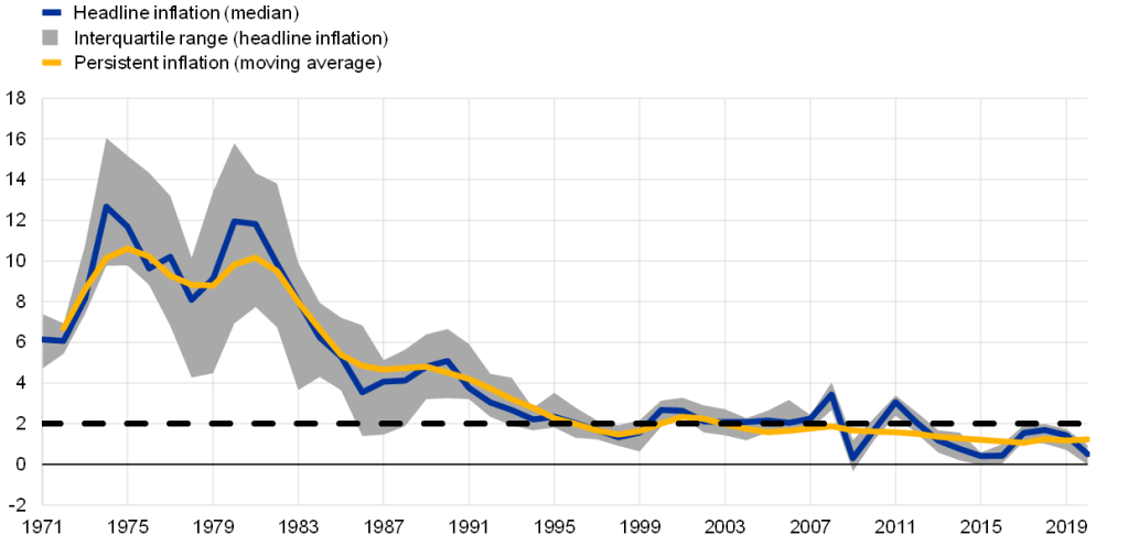 C’è però un punto che bisogna ricordare. Le economie avanzate, oggetto dell’analisi della Bce, hanno mostrato andamenti inflazionari sorprendentemente simili nel quindicennio fra l’inizio dei ’70 e la metà degli ’80 del XX secolo, quando i prezzi salivano – con la significativa eccezione della Germania e della Svizzera – a ritmi del 10%.