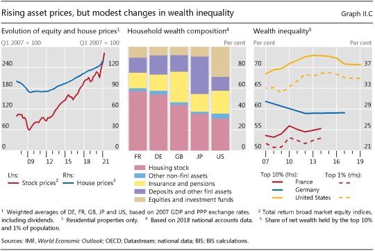 Una osservazione analoga si dovrebbe fare anche se guardiamo a un’altro tipo di diseguaglianza, quella della ricchezza, ossia del patrimonio. Quest’ultimo, che si compone di asset finanziari e reali – tipicamente gli immobili – è soggetto a un’imposizione fiscale, ma soprattutto è molto sensibile agli effetti della politica monetaria, pure se, secondo la Bis, gli effetti sulla diseguaglianza di queste politiche sono modesti e di breve termine.