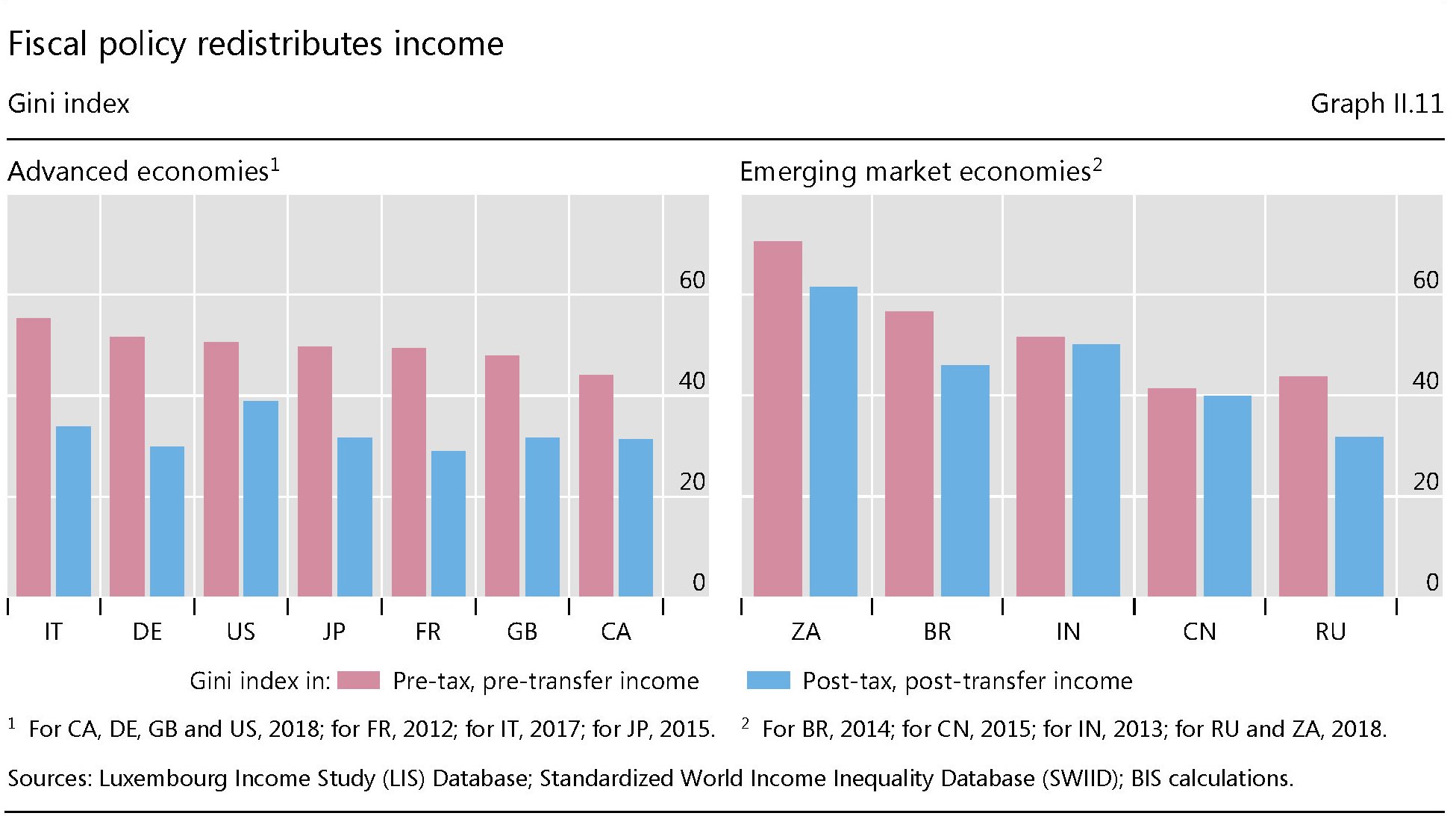 C’è un’altra cosa da ricordare. Quando parliamo di diseguaglianza dei redditi, dovremmo specificare sempre – cosa che raramente si fa – se la misuriamo prima o dopo l’imposizione fiscale e il contributo dei trasferimenti pubblici. Perché le differenze, misurate con l’indice di Gini, sono rilevanti, come si evince dal grafico (sotto) elaborato dalla Bis.