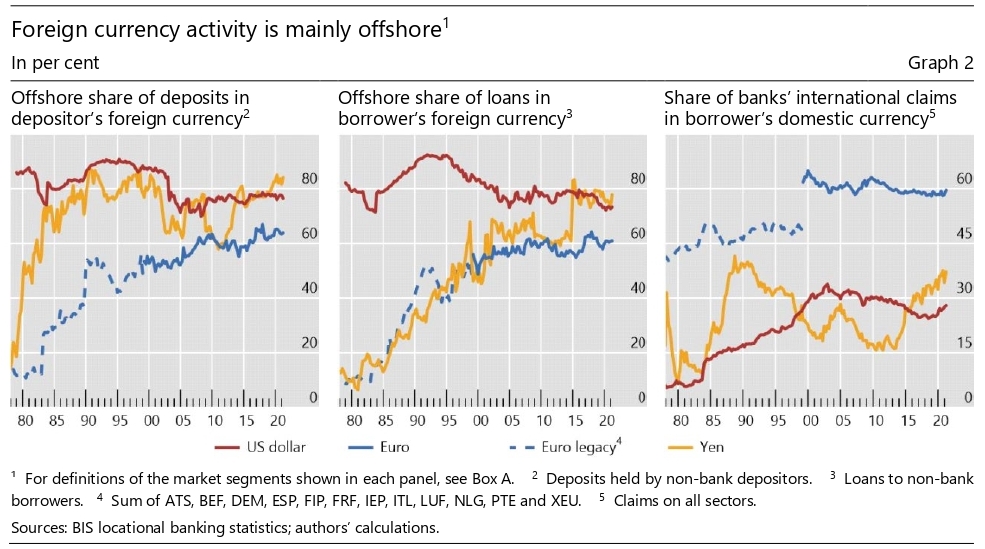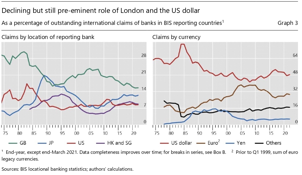 Questa tendenza non riguarda solo gli Usa. Anche le non banche europee e quelle giapponesi – queste ultime addirittura dagli anni Ottanta – depositano i loro fondi fuori dalla loro residenza. E questo spiega perché Londra abbia conservato una supremazia nel mercato bancario internazionale superiore a quella della sterlina in quello valutario.