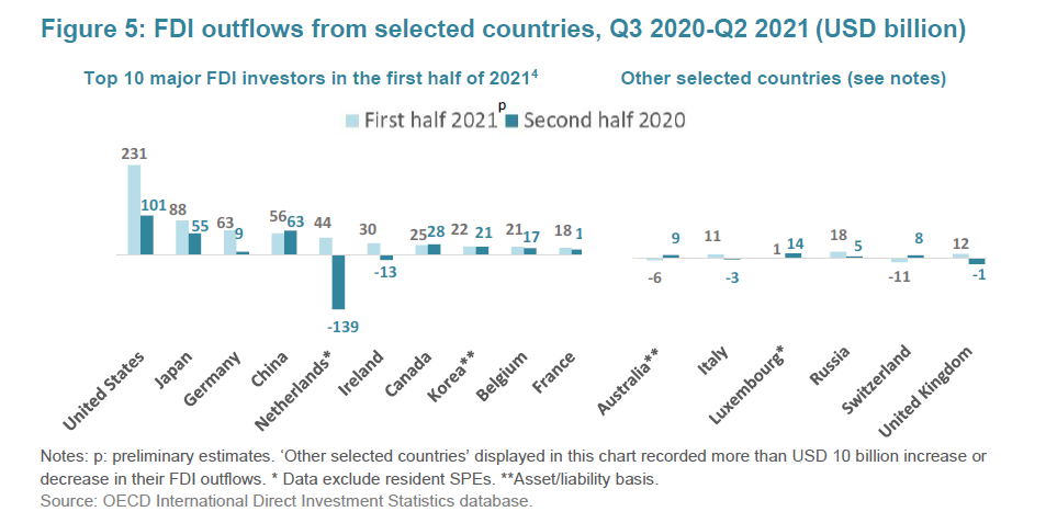 Gli afflussi di FDI nei paesi dell’Ocse sono aumentati di 421 miliardi, il doppio di quelli conteggiati nel 2020 e il 30% in più del livello pre-pandemia, mentre i deflussi dall’area Ocse sono quadruplicati rispetto al 2020 e cresciuti del 75% rispetto al 2019.