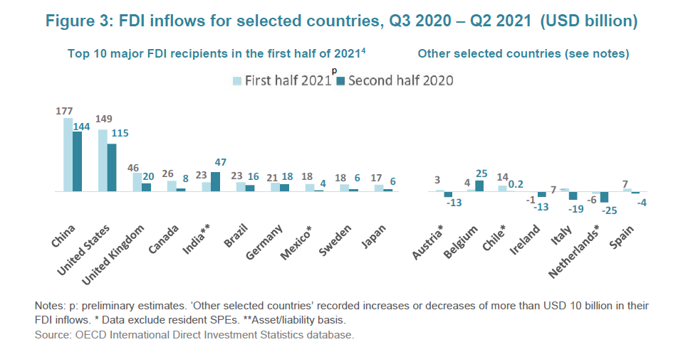 Nei paesi non Ocse, gli afflussi sono aumentati del 12%, con una crescita generalizzata in tutte le aree, con l’eccezione dell’India, mentre i deflussi sono aumentati del 24%. Il paese dove si è diretta la quota maggiore di FDI è stata la Cina, seguita da Usa e Regno Unito.