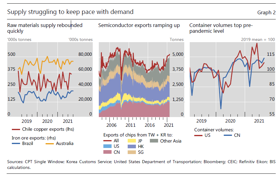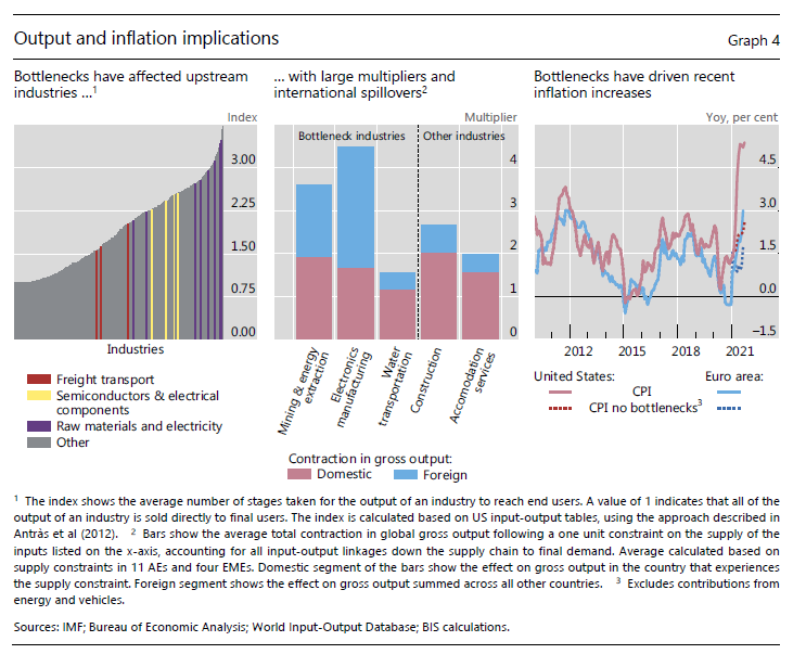 Rimangono domande senza risposta, ovviamente, perché nessuno ha la palla di vetro e tantomeno i previsori professionali, che continuano a rivedere al rialzo i loro calcoli. Perciò dobbiamo contentarci di continuare ad approfondire le ragioni di questa fiammata “transitoria”, magari profittando di un recente Bollettino preparato dalla Bis, che tratta proprio dell’origine (o di una delle origini) del problema: le famose strozzature sul lato dell’offerta.