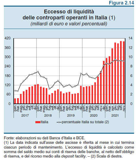 Per ragioni che sfuggono alla comprensione di molti, ma non degli addetti ai lavori, le banche italiane tengono fermi 400 miliardi di euro nei loro conti accesi presso la Banca d’Italia, che custodiscono amorevolmente le loro riserve. Si chiama liquidità in eccesso, nel senso che è molto più di quella che servirebbe, a norma di regolamenti. Per giunta è un eccesso crescente, visto che questa somma è aumentata di 95 miliardi rispetto a marzo scorso. E poiché superati i 112 miliardi l’eccesso ha un costo, ecco che le banche hanno speso 280 milioni per i loro eccessi nel 2020 e altri 1,1 miliardi di euro per quelli dei primi 11 mesi del 2021. Gli eccessi si pagano sempre. Quelli inspiegabili più degli altri.