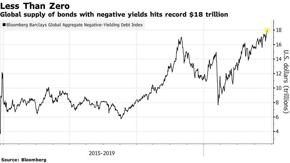 Perché questa tendenza diventa visibile proprio dal 2015? Gran parte di queste obbligazioni provenivano dall’Eurozona e dal Giappone, che proprio in quel periodo – e il Giappone assai prima dell’Europa – vararono misure di notevole allentamento monetario acquistando massicciamente obbligazioni sul mercato secondario per provare a rianimare la crescita e l’inflazione, oltre a portare i tassi ufficiali a zero. Un modo come un altro per sostenere indirettamente le emissioni pubbliche in un momento in cui la politica fiscale sembrava impotente a raddrizzare la curva stagnante della crescita economica.