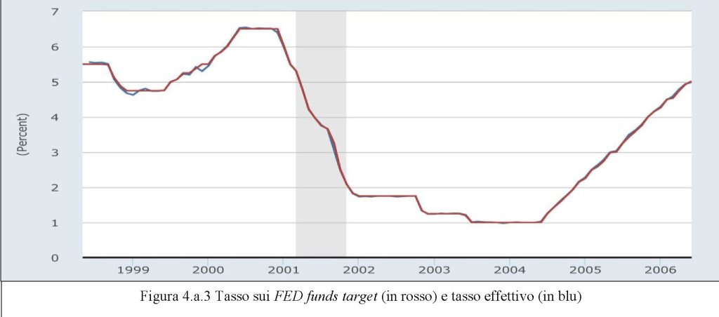 Se risaliamo la curva del tasso globale di interesse à rebours notiamo un abbassamento del tasso reale agli inizi degli anni 2000, quando la Fed portò i tassi nominali in pochi anni da oltre il 6% all’1%. Erano gli anni dello scoppio della bolla dei titoli di internet. Usiamo un tasso della Fed come punto di riferimento perché la banca centrale americana ha un notevole potere di orientamento sui tassi globali.