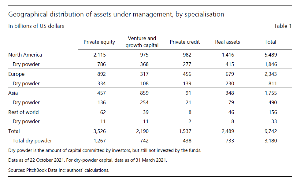 Oggi questi mercati “privati” sono molto ampi in Nord America e in Europa, e adesso si presentano anche in Asia. Complessivamente gestiscono masse per 10 trilioni di dollari, che sembrano poca cosa se li confrontiamo con i 40 trilioni gestiti dai Fondi di investimento (mutuls fund) non governativi, ma comunque sono un bel gruzzoletto. Il 56% di questa cifra è domiciliata in Usa, il 24 in Europa e il 18% in Asia. La tabella sotto fornisce ulteriori informazioni.