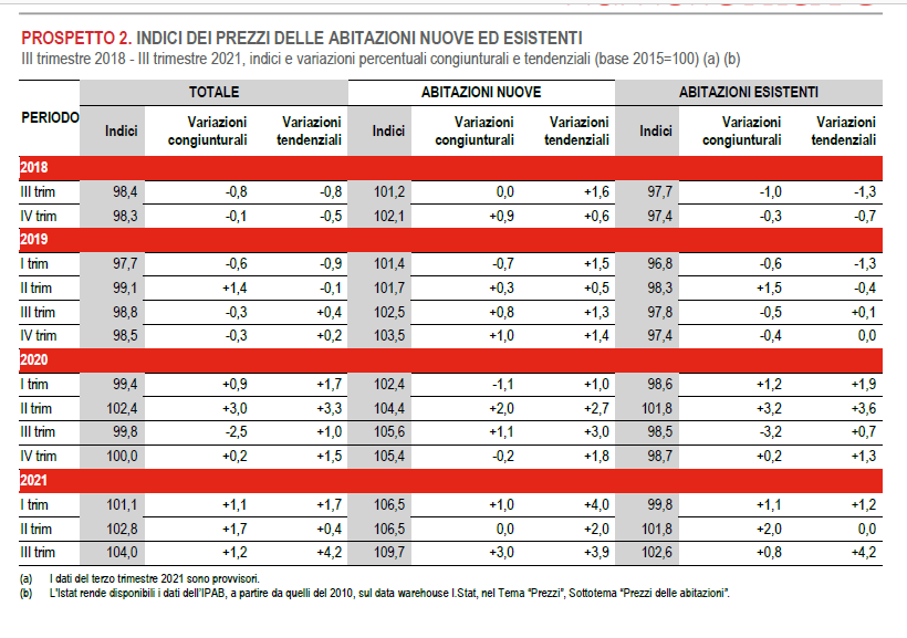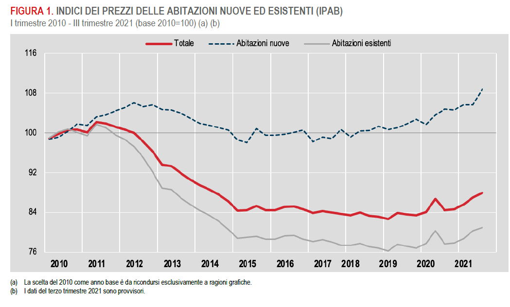 Meglio tardi che mai, viene da dire guardando il progresso dell’indice Ipab costruito da Istat per monitorare i prezzi delle abitazioni, nuove e usate. I dati rilasciati alcuni giorni fa sul terzo trimestre 2021 confermano il trend ascendente dei corsi immobiliari, aumentati dell’1,2% rispetto al secondo trimestre e del 4,2% rispetto al terzo trimestre 2020. Su base annua, è un incremento molto significativo, se paragonato agli anni recenti, e soprattutto è importante perché conferma un andamento che dura ormai da quattro trimestri.