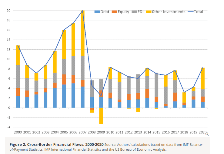 Il grafico sopra ci comunica anche un’altra informazione. Ossia che la fase più intensa della globalizzazione, quella iniziata nei primi anni 2000, ha subito un rallentamento. E questo ha riguardato sia i flussi di beni che quelli di capitale, visibili dal grafico sotto.