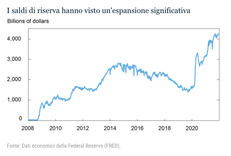 Il grafico sopra rappresenta questa situazione. La Fed nel 2008 teneva le riserve bancarie quasi a zero, e di conseguenza il suo bilancio era particolarmente scarico. Oggi le riserve pesano quattro trilioni nel bilancio Fed.