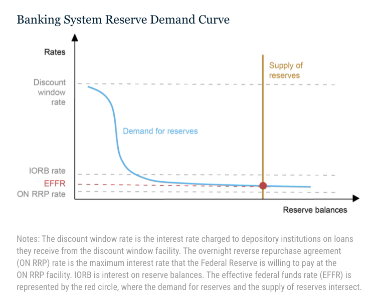 Il fatto che si tenessero a zero le riserve bancarie implicava che il tasso obiettivo della Fed (effective federal funds rate (EFFR) fosse perseguito utilizzando la strategia dei corridoi, al quale partecipa il tasso sulle riserve bancarie, tramite lo strumenti delle operazioni di mercato aperto.