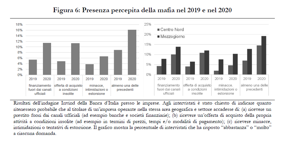 La pandemia ha aumentato notevolmente la percezione (grafico sopra) della presenza criminale fra gli addetti ai lavori. Infatti “la percentuale di imprese che ritiene abbastanza o molto probabile che si siano verificati fenomeni legati alla criminalità organizzata nel mercato in cui operano è passata dal 9 per cento del 2019 al 16 per cento nel 2020”, con il Centro Nord del paese a tirare la volata da un punto di vista geografico e alloggi, ristorazione e tessile dal punto di vista settoriale.