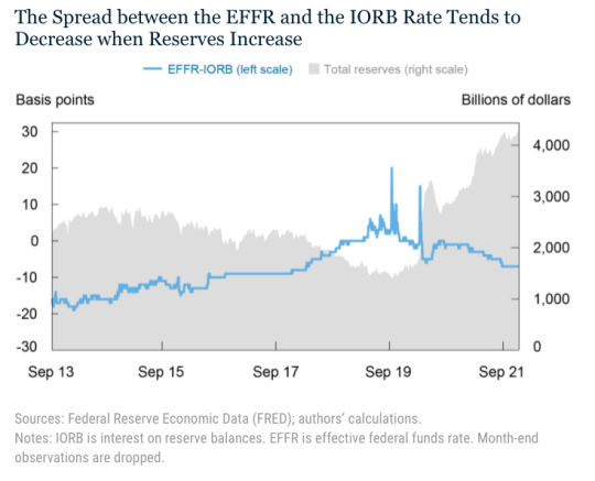 Una volta che abbiamo compreso il funzionamento del corridoio, all’interno del quale il tasso EFFR (Fed Funds rate) oscilla stretto fra il tetto rappresentato dal tasso sulle riserve (tasso IORB) e quello sui reverse repo overnight (tasso ONRRP),