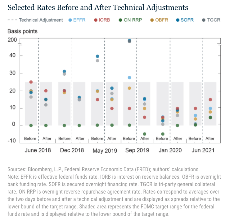 La Fed si è servita più volte di queste strategie per tenere ben al guinzaglio il tasso principale all’interno del corridoio. Il grafico sotto riepiloga alcuni di questi “aggiustamenti”.