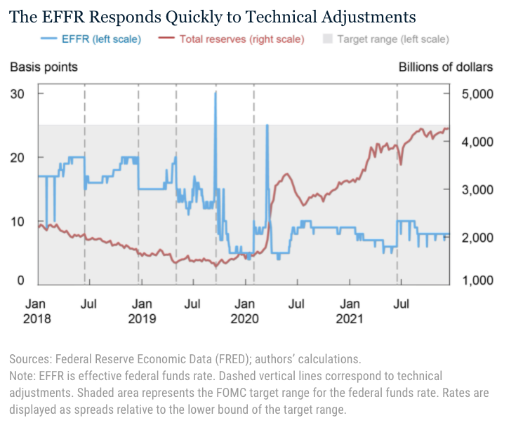 Una volta che abbiamo compreso il funzionamento del corridoio, all’interno del quale il tasso EFFR (Fed Funds rate) oscilla stretto fra il tetto rappresentato dal tasso sulle riserve (tasso IORB) e quello sui reverse repo overnight (tasso ONRRP),