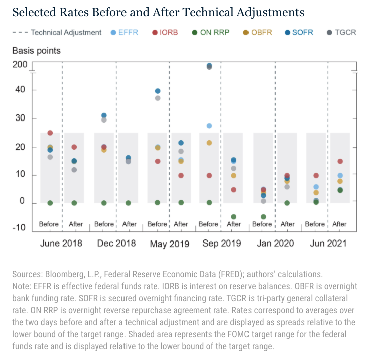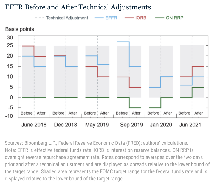 La Fed si è servita più volte di queste strategie per tenere ben al guinzaglio il tasso principale all’interno del corridoio. Il grafico sotto riepiloga alcuni di questi “aggiustamenti”.