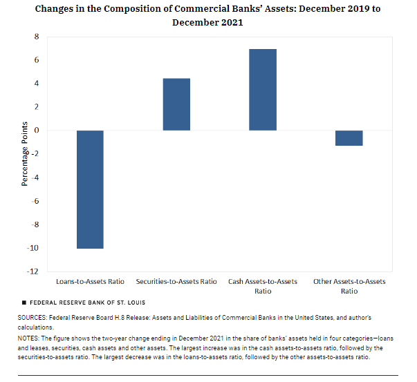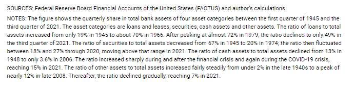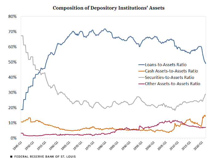 L’accaduto è molto chiaro. La quota di prestiti sul totale degli asset è diminuita drasticamente. Per dirla con le parole della Fed, “ha raggiunto il livello più basso dal 1955”.