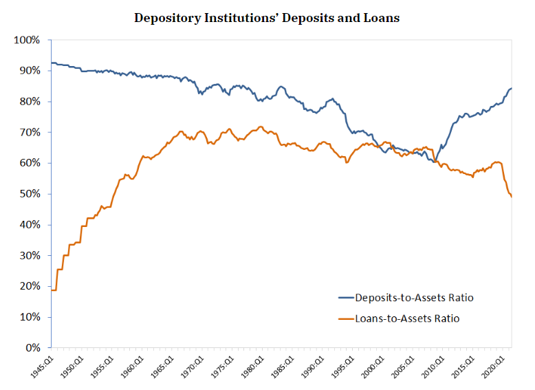 Il declino della quota dei depositi inizia nell’immediato dopoguerra, in corrispondenza di un sostanziale aumento del totale dei prestiti, e prosegue, con brevi momenti di interruzione fino ai primi anni 2000, quando per la prima volta la quota dei depositi supera quella dei prestiti. Dopo il 2008 i depositi decollano e i prestiti crollano, trend che la pandemia ha semplicemente accelerato.
