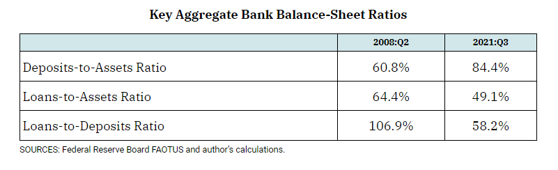 La prima parte di questo racconto, che illustra la storia degli attivi bancari Usa, la abbiamo già letta. Per la seconda parte, quella che ricostruisce l’andamento del passivo, ci affidiamo all’ottima ricognizione proposta dalla Fed di S.Louis, che contiene tutti i dati di cui abbiamo bisogno. Il primo dei quali, che ci dice molto di quello che dobbiamo sapere, è il rapporto fra prestiti e depositi (loans-to-deposits ratio, LTDR) che è un ottimo indicatore della profittabilità, e quindi della rischiosità, di un bilancio bancario. Avere molti prestiti rispetto ai depositi significa che la banca ha molte risorse impegnate nelle attività più rischiose – e quindi più profittevoli – e viceversa. La tabella sotto ci consente di osservare questo indicatore nel confronto fra il secondo trimestre 2008, ossia prima della Grande Crisi finanziaria, e nell’ultimo trimestre 2021, ossia dopo la crisi Covid.