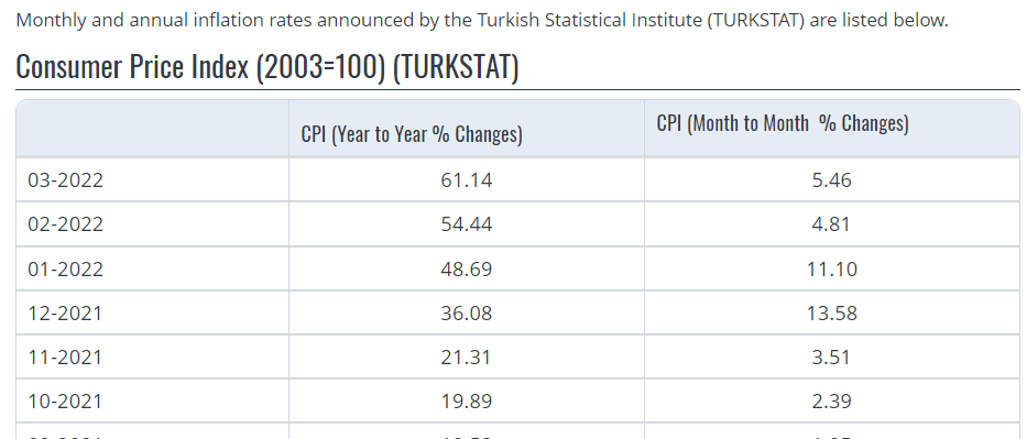 Gli ultimi dati sull’inflazione turca, con l’indice in crescita del 61,4% a marzo su base annua, confermano la drammatica crescita dei prezzi nel paese, che ormai ha preso un andamento alquanto progressivo. I dati degli ultimi mesi lo manifestano chiaramente.
