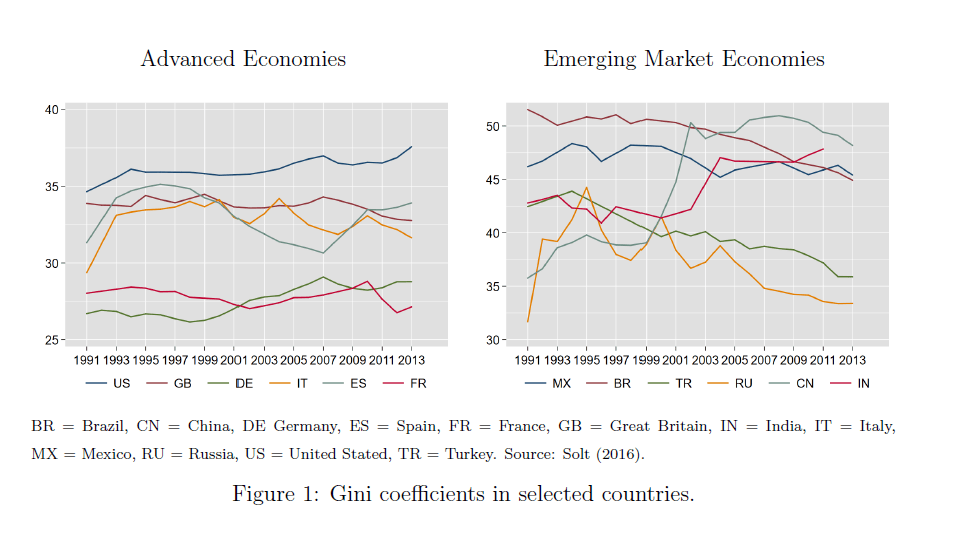 La ricerca per arrivare ad alcune conclusioni ha svolto un’analisi su 48 economie, analizzandone i dati fra il 1991 e il 2013. In dettaglio, i ricercatori hanno cercato un collegamento fra una delle tante possibili misure dell’apertura finanziaria – il debito estero lordo nelle sue varie componenti (investimenti diretti, IDE; investimenti di portafoglio, PD e altri investimenti) – e la diseguaglianza, segmentando l’analisi fra economie emergenti ed economie avanzate. Il grafico sotto mostra l’andamento dell’indice di Gini, che come è noto è una delle tante possibili misure della diseguaglianza, nell’arco di tempo considerato nei paesi oggetto di osservazione.