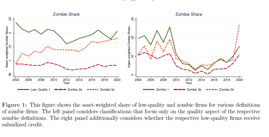 Ma non c’è solo l’inflazione che dovrebbe preoccuparci. Un recente paper pubblicato dal Nber ci ricorda un’altra delle conseguenze non intenzionali che l’allargarsi della generosità – leggi sussidi – ha provocato nel nostro tessuto socioeconomico: la straordinaria crescita di imprese zombie. Ossia imprese che stanno a galla solo perché sono sussidiate in vari modi, a cominciare dal costo ridotto del loro servizio del debito.