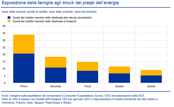 Per una corretta interpretazione del grafico sopra, dovete sapere che i primi, quelli dall’istogramma più alto, sono gli ultimi. Nel senso che sono quelli che se la passano peggio degli altri nella distribuzione (ufficiale) dei redditi. Questi ultimi, di conseguenza, sono quelli che soffrono di più i guasti provocati dal caro energia, visto che, come i primi, ossia quelli che tanno in cima alla piramide del reddito, devono pagare le bollette e fare il pieno, ma a differenza loro, per gli ultimi queste due incombenze sono già un fardello niente male nella contabilità familiare. Fra bollette e trasporti, si calcola infatti che impegnino già quasi il 35 per cento dei loro redditi. Ed ecco che il grafico si chiarisce. Gli ultimi saranno i primi, assicurava qualcuno. Per adesso solo quando si tratta di pagare.