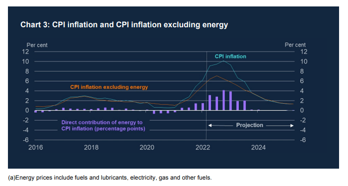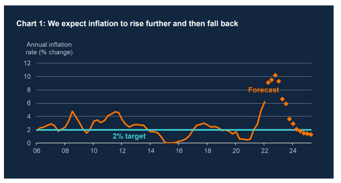 La Bank of England (BoE) stima che entro il quarto trimestre del 2022 l’inflazione in UK arriverà alla doppia cifra, alla quale si è avvicinata anche di recente, visto che l’indice dei prezzi al consumo è arrivato al 9%. La situazione è rappresentata nel grafico sotto, che va preso con le dovute cautele, quanto alle previsioni, visto che finora il futuro si è mostrato molto più “inflazionistico” di quanto fosse stato previsto.