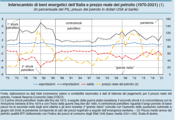 La buona notizia è che siamo ancora lontani dal disavanzo toccato all’epoca degli shock petroliferi – il 5,8% del pil, nel 1981 (grafico sotto) -; quella meno buona è che il dato 2021 non tiene conto della guerra iniziata a febbraio del 2022, che sta generando nuove pressioni al rialzo sui prezzi dei beni energetici.