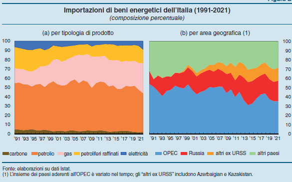 Il grafico sopra a destra ci consente anche di farci un’idea dei paesi di provenienza, fra i quali si nota il peso rilevante della Russia, cresciuto nel tempo. Capirete perché le previsioni sul nostro saldo energetico siano alquanto pessimistiche.