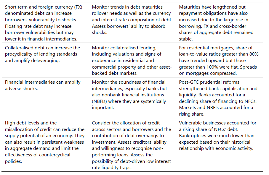 E questo ci porta alla seconda parte del paper: la relazione fra livello di indebitamento e stabilità finanziaria. Senza bisogno di farla troppo lunga, sono diversi i canali attraverso i quali il livello dei debiti – vale per quelli privati che stiamo osservando, ma osservazioni simili si possono fare anche per il debito del governo – si comunica al sistema finanziario, rendendolo più o meno stabile. La tabella sotto basterà a riepilogare.