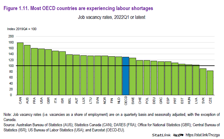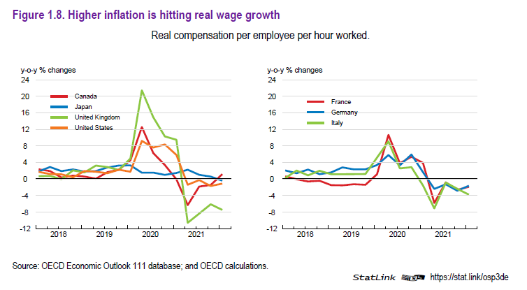 Ormai è chiara a tutti la complessità del problema di fronte al quale ci troviamo. Proviamo a riepilogare prendendo a prestito alcuni dati diffusi da Ocse nel suo ultimo outlook. Primo tema: i salari. In alcuni paesi, come il nostro, già sottodimensionati da tempo, adesso vengono rapidamente impoveriti da un’inflazione molto veloce.