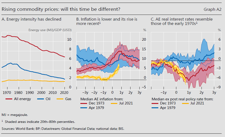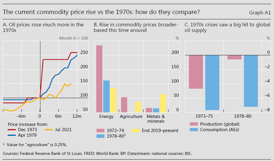 Un divertente approfondimento pubblicato nell’ultimo rapporto annuale della Bis, mette a confronto lo shock petrolifero degli anni ’70, che come abbiamo visto stanno tornando in voga, con l’andamento del costo dell’energia, con annessi e connessi inflazionistici, che stiamo patendo in questo disgraziatissimo 2022. Ne conclude che tutto sommato lo shock petrolifero questa volta non c’è stato, o almeno nella misura in cui si consumarono quelli del 1973 e del 1979. Se non altro – e non è poco – perché i prezzi del petrolio non aumentarono allora quanto sono aumentati oggi.
