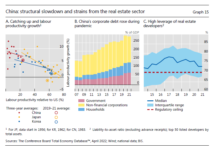 Gli altri due grafici ci raccontano invece di altri due grossi problemi strutturali che aleggiano come avvoltoio sul corpaccione della crescita cinese: da una parte l’aumento rilevante del debito complessivo, in particolare di quello corporate. Dall’altra le notorie difficoltà nel settore immobiliare, che è stato uno dei grandi “stimolatori” della crescita cinese e adesso rischia di provocare l’effetto di stimolare la crisi.