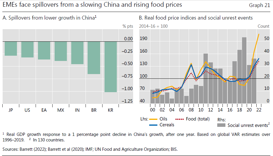 Il problema è che la Cina ha assunto un peso rilevante nell’economia internazionale. La Bis calcola che circa un quarto della crescita globale provenga da laggiù, con l’aggravante che i i cinesi hanno finito col diventare una componente rilevante della domanda globale. Il grafico sotto a sinistra quantifica alcune stime dell’effetto che può avere il calo di un punto di pil della Cina sul alcuni paesi e regioni.