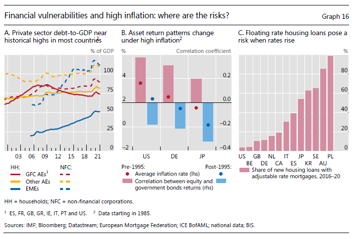 Il contesto internazionale, inoltre, espone per la prima volta dal dopoguerra un menù dove si sovrappongono pressioni inflazionistiche importanti a un contesto finanziario infragilito da un decennio abbondante di politiche monetarie allentate. Un pessimo assortimento, specie quando ci si aspetta una stretta monetaria sostanzialmente globale, che per adesso ha risparmiato la Cina e il Giappone, ma non per questo sarà meno perniciosa, come ha ben chiaro chi conosce i flussi finanziari internazionali. Il grafico sotto illustra alcuni dei rischi annidati in questo scenario.