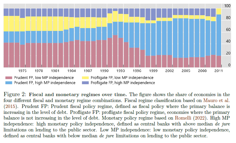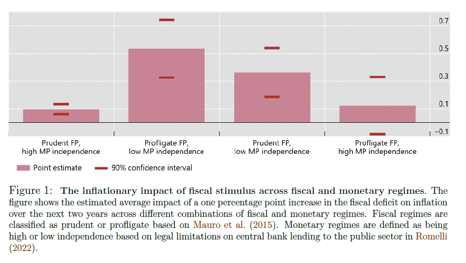 Notate che l’effetto inflazionistico minore si ottiene associando una fiscal policy (FP) prudente a un’alta indipendenza della monetary policy (MP). In presenza di quest’ultimo requisito, anche una politica fiscale imprudente – notate l’uso dell’aggettivo profligate, che significa spendaccione, dissoluto – riesce ad essere contenuta da un punto di vista inflazionistico, mentre diventa impossibile se la banca centrale non fa il suo dovere.