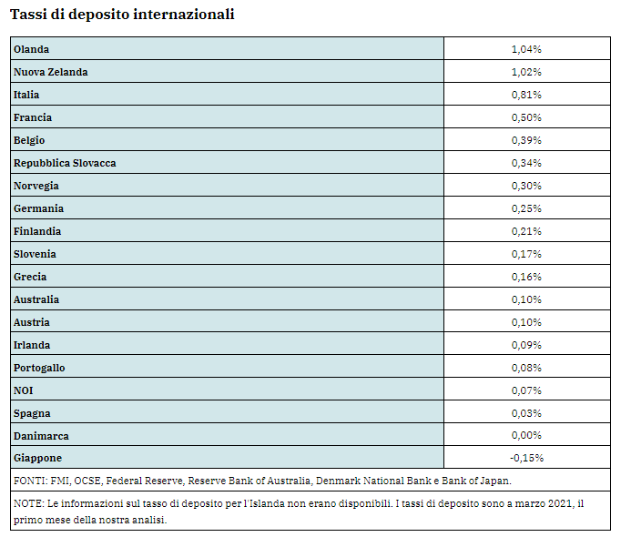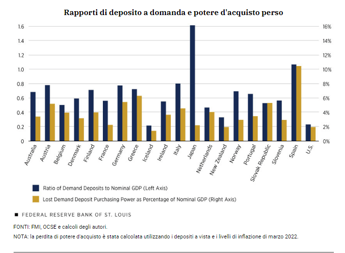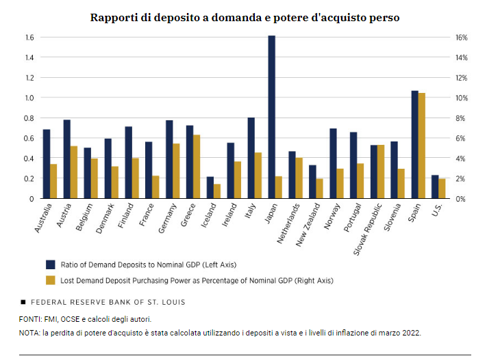 Se si confronta il potere d’acquisto perduto dai depositanti con il pil del paese, scopriamo che in alcuni posti, come il Giappone, dove i depositi bancari sono 1,6 volte il valore del pil, i correntisti hanno perso il 2 per cento del loro potere d’acquisto, visto che laggiù l’inflazione è assai più bassa che nel resto del mondo. In Italia invece le perdite di potere d’acquisto per i correntisti, malgrado i depositi complessivi corrispondano a 0,8 volte il pil, la perdita ha superato il 4 per cento. In Spagna è andata ancora peggio: l’erosione del potere d’acquisto dei depositi ha superato il 10 per cento del pil.