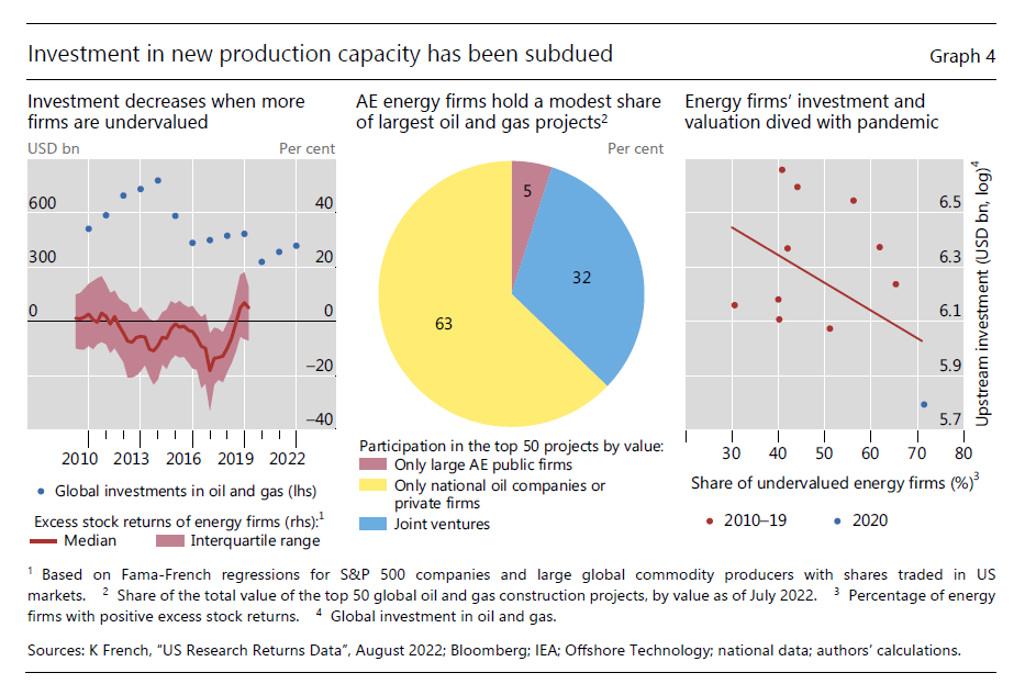 L’ultimo bollettino della Bis racconta che malgrado la crisi energetica provocata dall’attacco russo in Ucraina, le compagnie energetiche delle economie avanzate non sono ancora riuscite a recuperare un livello soddisfacente di investimenti, che pure dovrebbero servire a generare flussi di produzione alternativa a quella russa, che tutti dicono di voler sostituire.