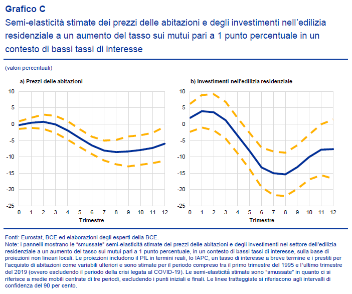 Infatti, raffinando il modello, viene fuori che un rialzo dei tassi deciso in un contesto di bassi tassi può condurre a un calo dei corsi residenziali del 9 per cento, sempre dopo due anni, e degli investimenti del 15. Non esistono pasti gratis, in nessun senso.