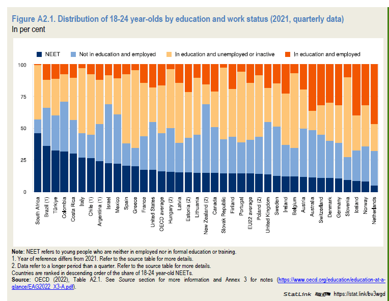 L’ultimo rapporto sull’istruzione pubblicato da Ocse ci ricorda una delle anomalie più vistose del nostro sistema sociale travestito ormai da normalità statistica dopo l’invenzione di un brutto acronimo – NEET, che sta per not in education, employment or training – che rappresenta icasticamente lo stato esistenziale di molta gioventù.