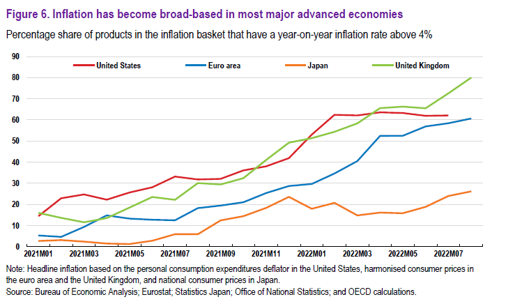 Forse no. Se iniziassimo a guardare al processo inflazionistico come qualcosa di più complesso che un semplice travaso di rincari da un bene all’altro, forse potremmo arrivare a comprendere che la spirale dei prezzi si avvita molto più velocemente – e quindi l’indice accelera – quando in un’economia giungono al punto di rottura situazioni di crisi concomitanti. Questo riverberarsi di uno stato di crisi si espande agli spiriti animali degli agenti economici proprio come il contagio dei prezzi energetici verso gli altri. Ormai in Gran Bretagna l’80 per cento dei beni del basket dal quale si estrae l’indice ha un tasso di crescita dei prezzi che supera il 4 per cento. Nell’eurozona siamo arrivati a 60, mentre il solito Giappone non arriva al 30.