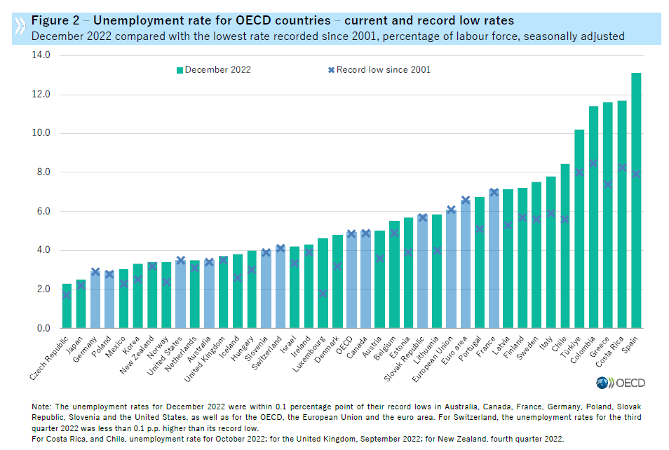 Gli ultimi dati Ocse sulla disoccupazione confermano che i mercati del lavoro sono in buona salute un po’ ovunque, anzi: persino “tirati”. Il tasso nell’area è rimasto inchiodato al 4,9% a dicembre 2022, “il sesto mese consecutivo a questo livello, al record più basso dall’inizio della serie nel 2001”.